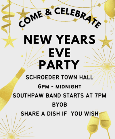 Come & Celebrate! New Year’s Eve Party at the Schroeder Town Hall from 6 pm until midnight. It features Southpaw Band starting at 7 pm. BYOB and bring a dish to share, if you wish.