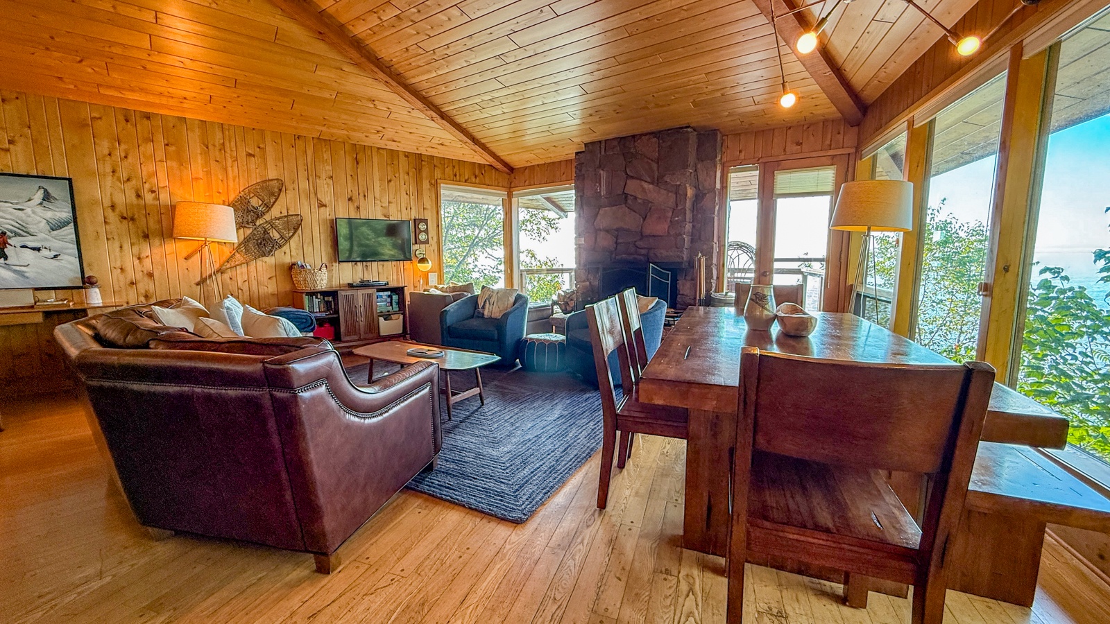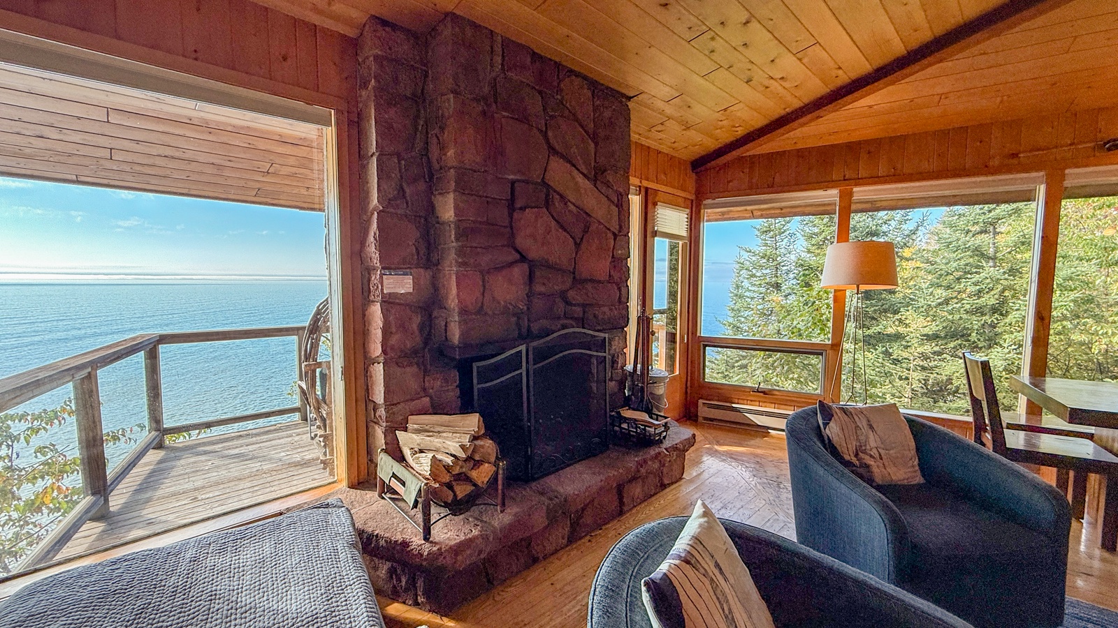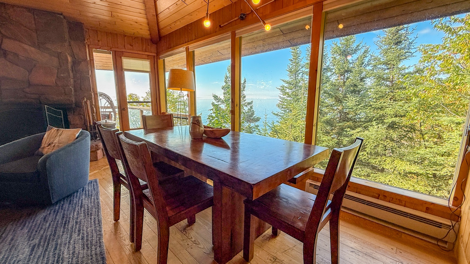 Enter into the Great Room of this three-bedroom vacation home here in Lutsen and be amazed by the majesty of the Great Lake. With commanding 180 degree views of Lake Superior, your stay is enhanced with a massive natural stone fireplace combined with a walk-out deck having the big lake serve as your companion.