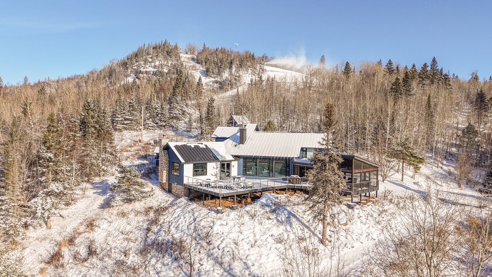 The house provides everything needed to enjoy both indoor and outdoor activities. There is an expansive deck, with an enclosed heated area, and a large gas grill. The entire deck provides breathtaking views of Lake Superior and Moose Mountain from its premium mountaintop location. Below the deck is a fire pit.