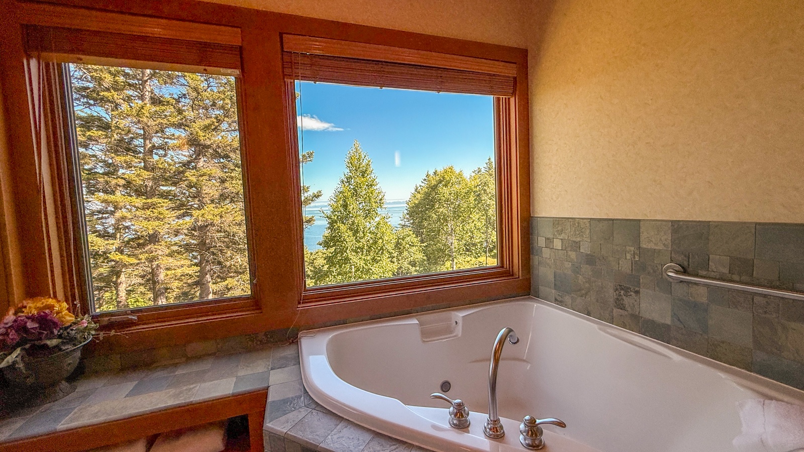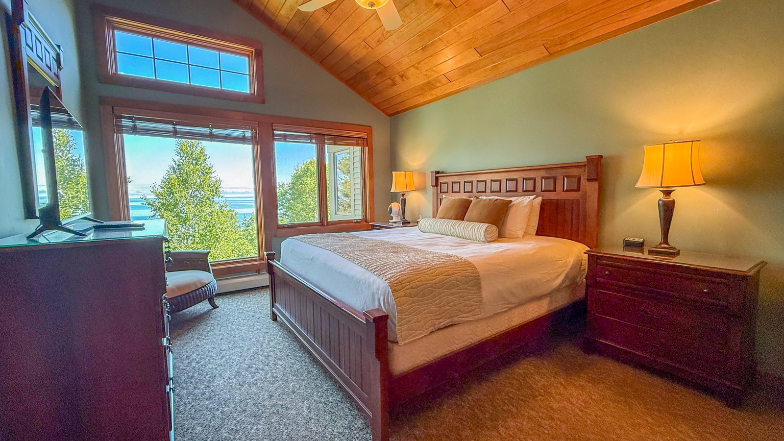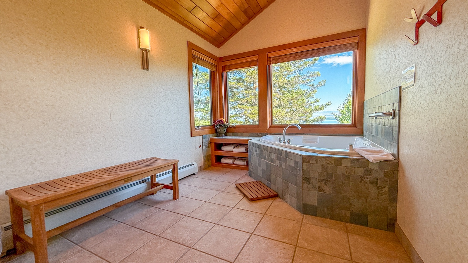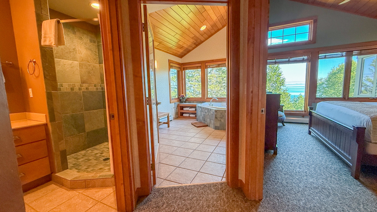 Upstairs you will find the luxurious 3-room primary bedroom suite. This suite features a spa-like retreat with a deep jetted tub, a bedroom with a king bed, and a separate bathroom with a stone-surround walk-in shower. The spa room and the bedroom both have incredible Lake Superior views! The rooms are closed off from a mutual door but can be left open for other guests to enjoy the space. Down the hall you will find the third bedroom, this one with a queen bed, and an attached bathroom.