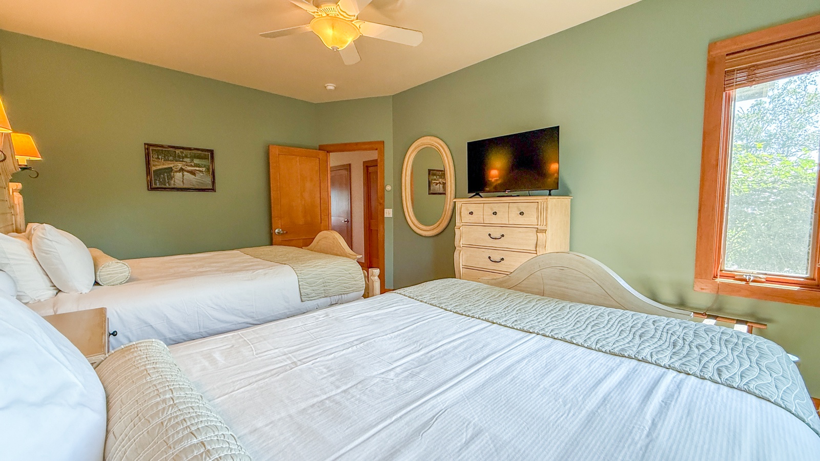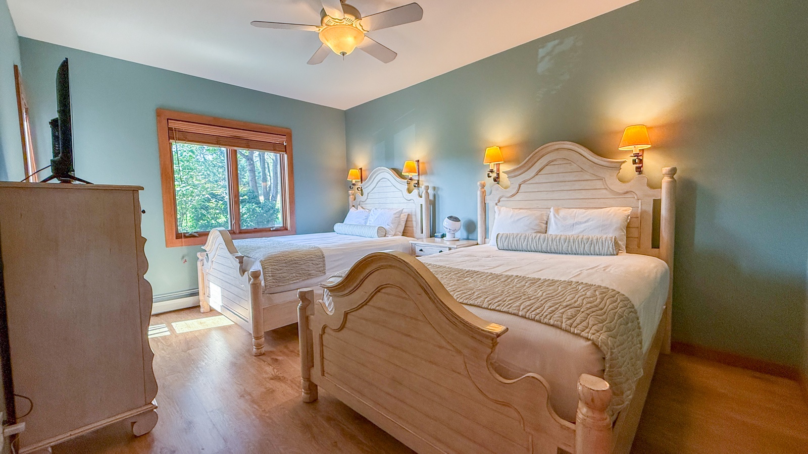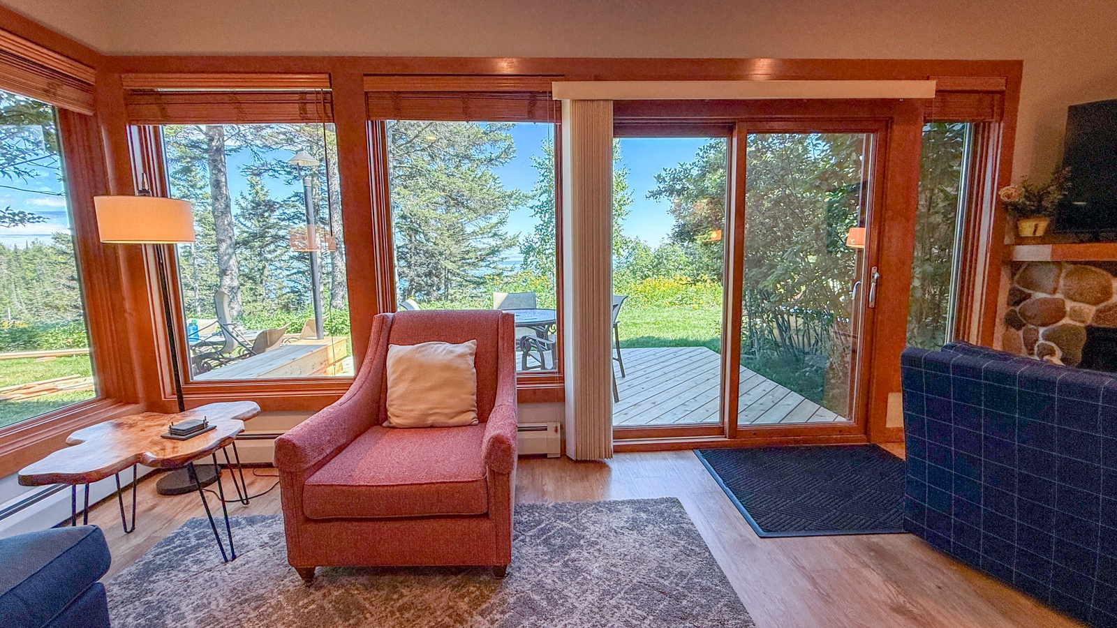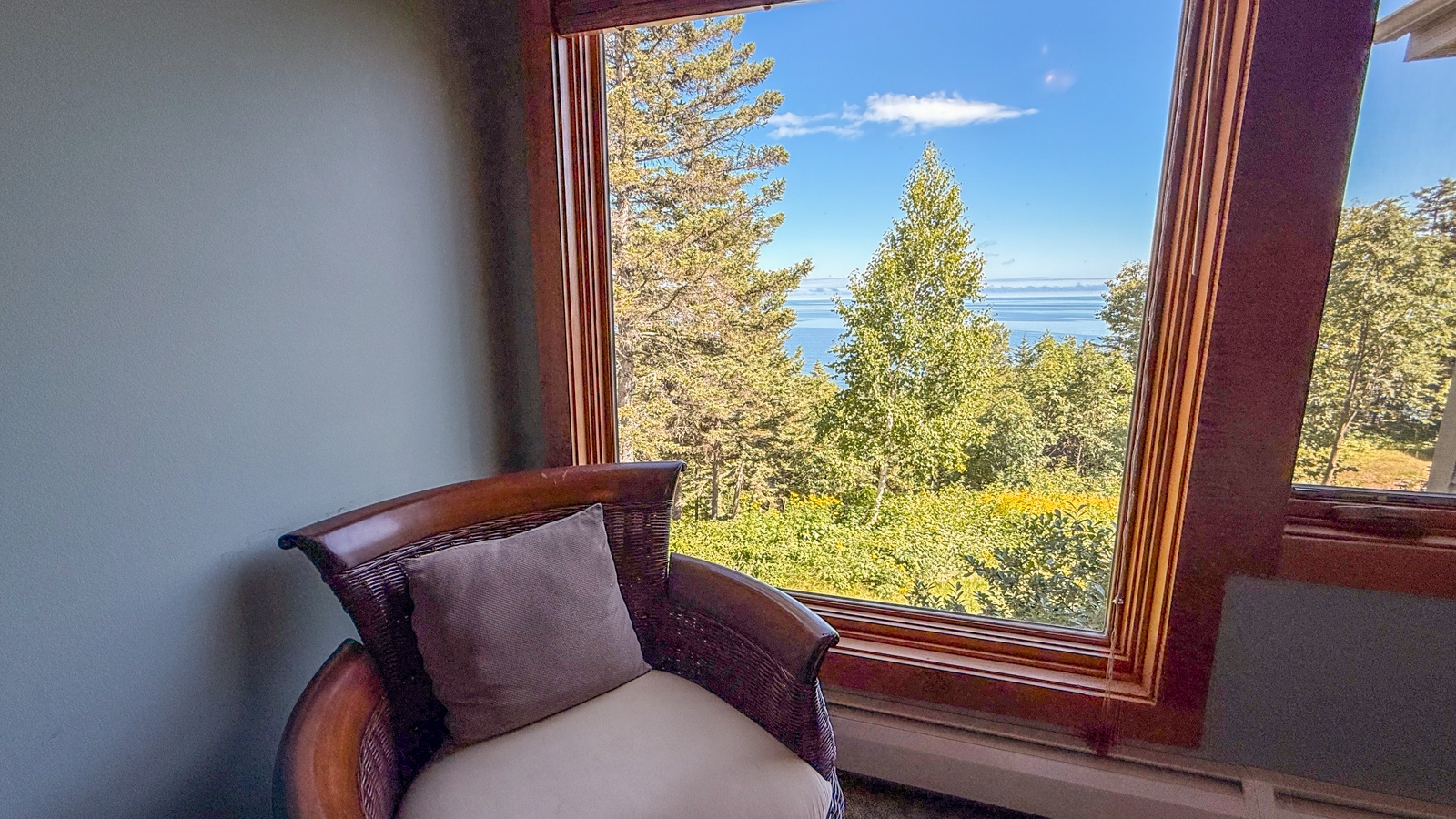 Upstairs you will find the luxurious 3-room primary bedroom suite. This suite features a spa-like retreat with a deep jetted tub, a bedroom with a king bed, and a separate bathroom with a stone-surround walk-in shower. The spa room and the bedroom both have incredible Lake Superior views! The rooms are closed off from a mutual door but can be left open for other guests to enjoy the space. Down the hall you will find the third bedroom, this one with a queen bed, and an attached bathroom.