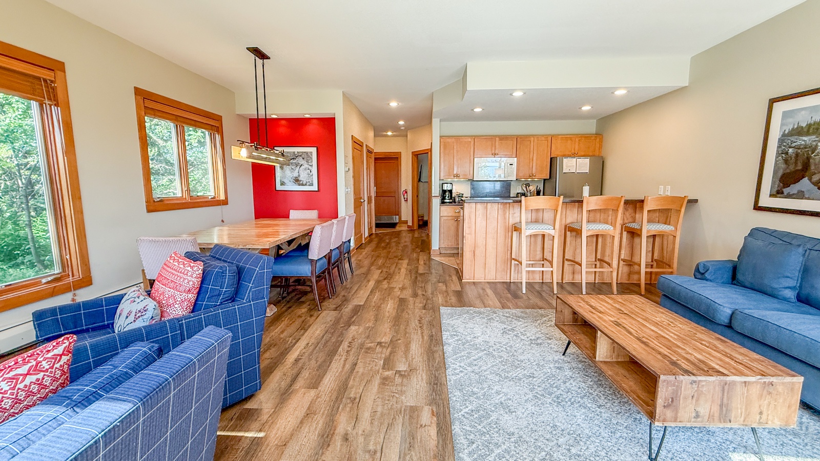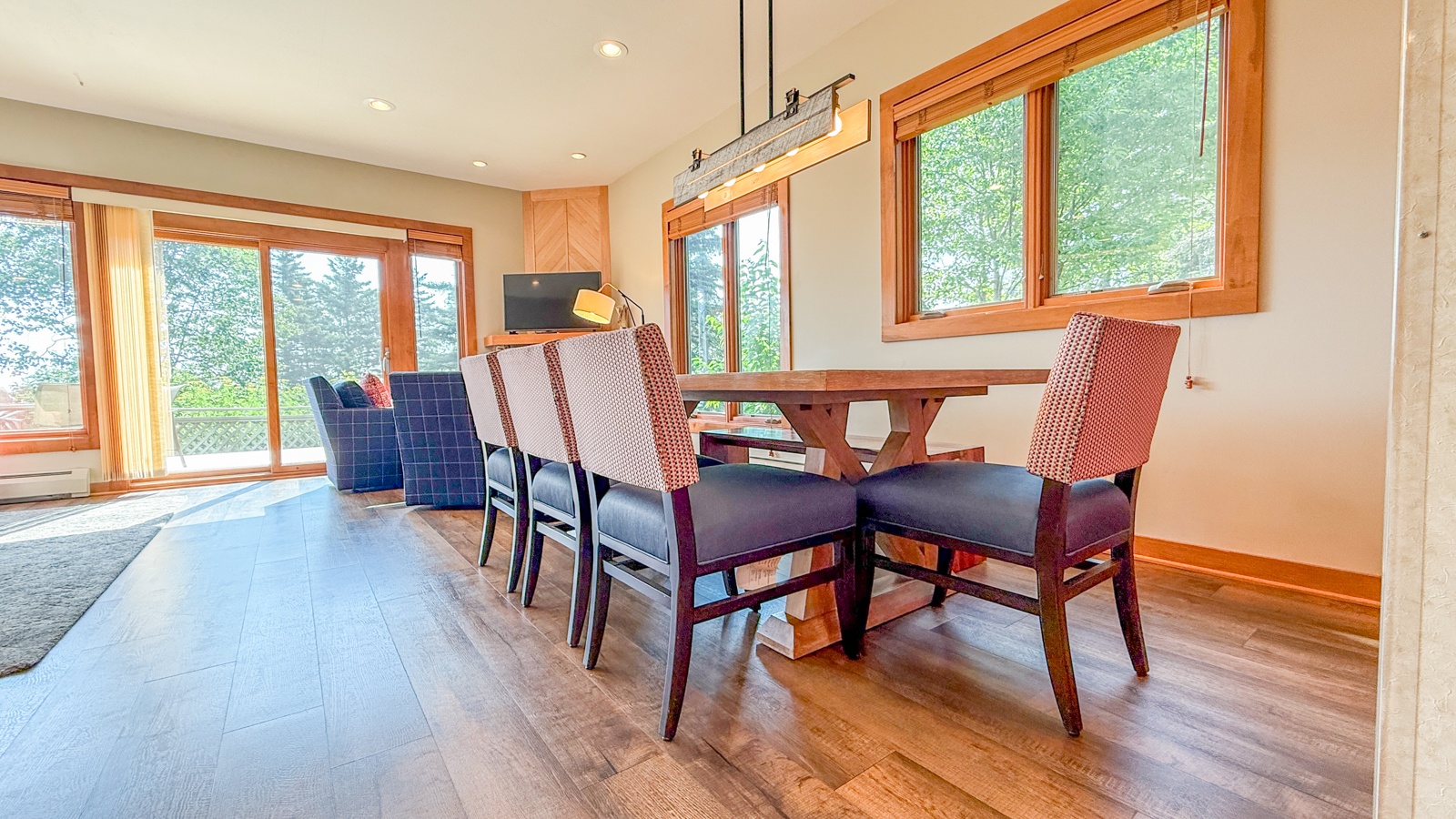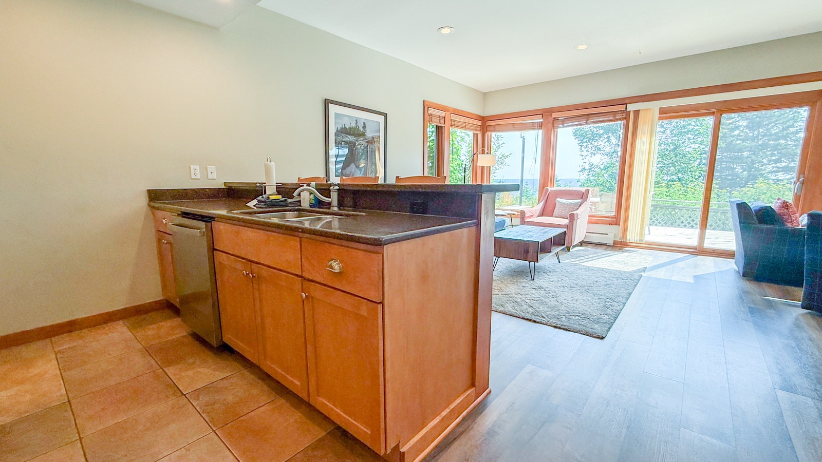 Cliffhouse 679 is an end-unit with 180-degree views of Lake Superior. The home features three bedrooms and three bathrooms located over two spacious levels. On the main level, you will find an open layout living space with a galley-style kitchen that is open to the living room. Enjoy a home-cooked meal in the dining room area where there is seating for seven with additional seating at the kitchen bar. Relax in the home's living room and enjoy large Lake Superior-facing windows. Step out on the lake-facing deck where you can enjoy cooking a summertime BBQ on the shared community gas grill. A bedroom with two queen beds and a full bathroom complete the main level.