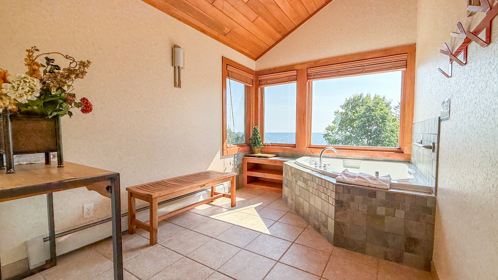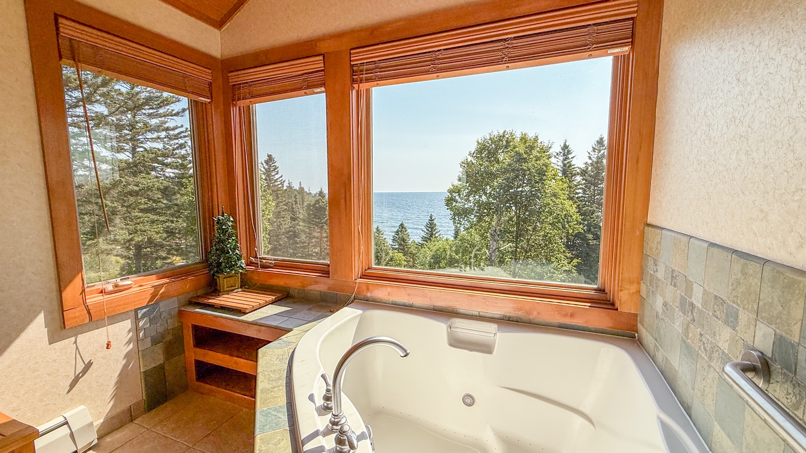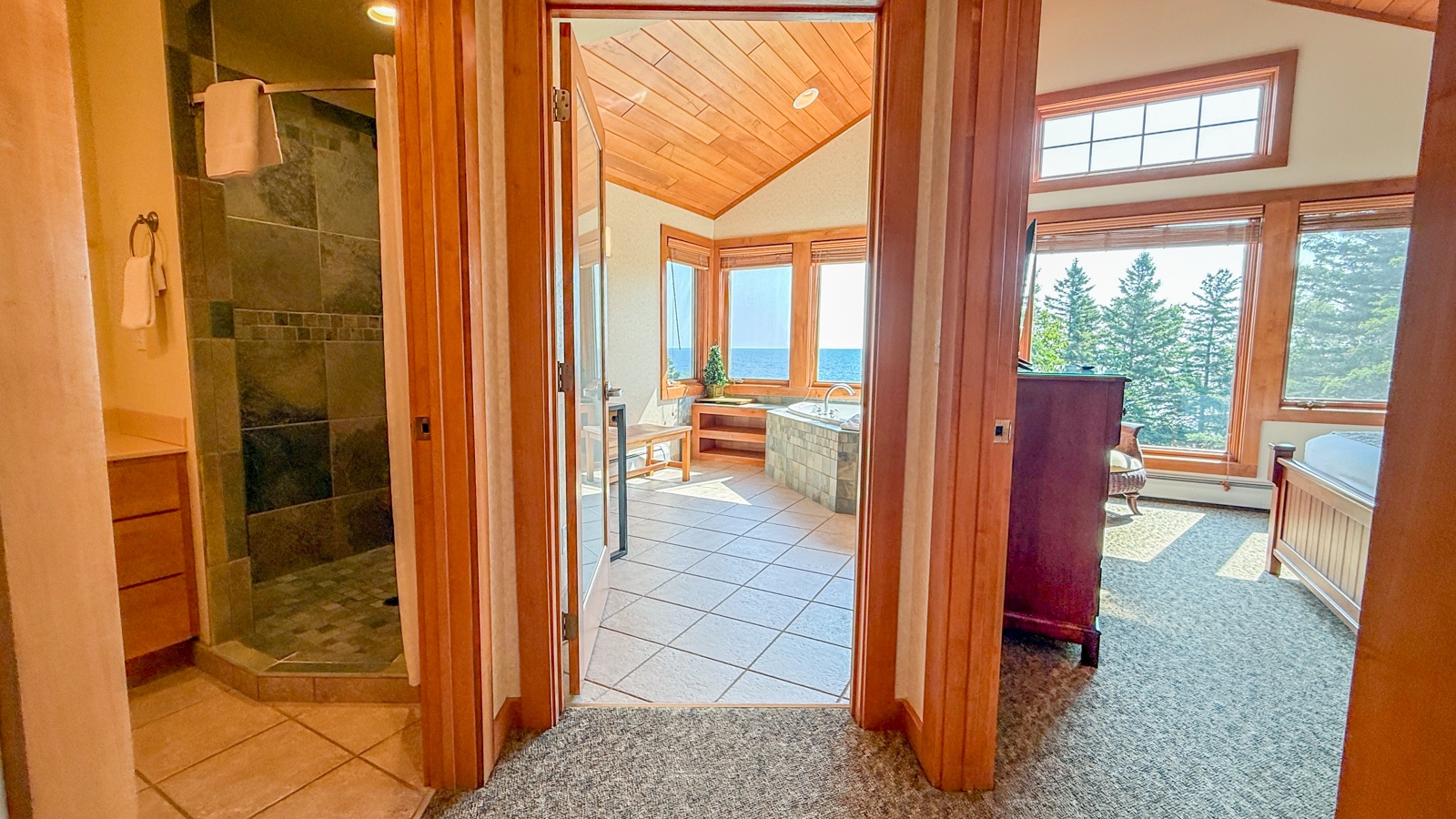 Upstairs you will find the luxurious 3-room primary bedroom suite. This suite features a spa-like retreat with a deep jetted tub, a bedroom with a king bed, and a separate bathroom with a stone-surround walk-in shower. The spa room and the bedroom both have incredible Lake Superior views! The rooms are closed off from a mutual door but can be left open for other guests to enjoy the space. Down the hall you will find the third bedroom, this one with a queen bed, and an attached bathroom.