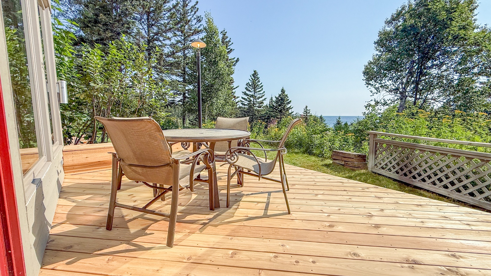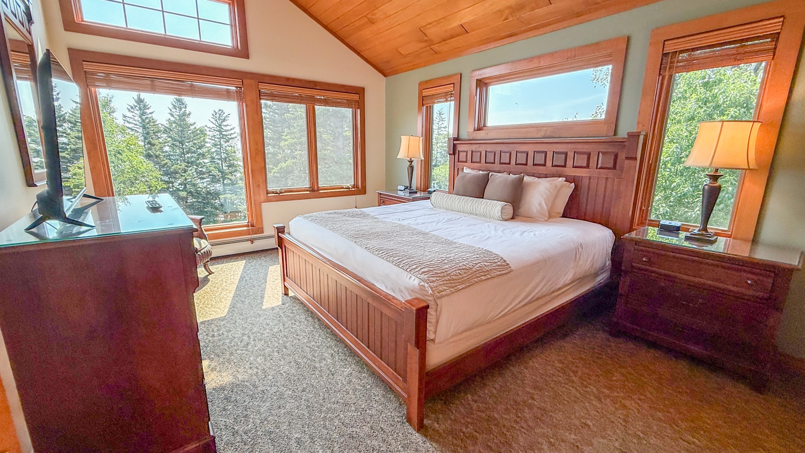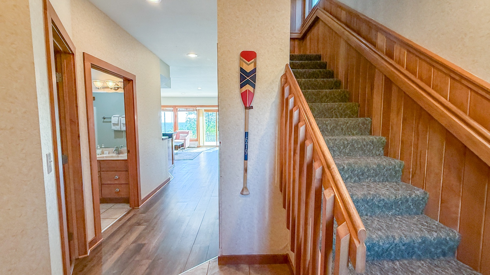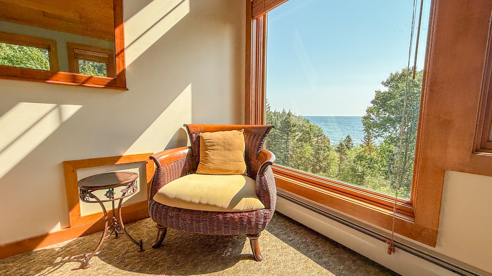 Upstairs you will find the luxurious 3-room primary bedroom suite. This suite features a spa-like retreat with a deep jetted tub, a bedroom with a king bed, and a separate bathroom with a stone-surround walk-in shower. The spa room and the bedroom both have incredible Lake Superior views! The rooms are closed off from a mutual door but can be left open for other guests to enjoy the space. Down the hall you will find the third bedroom, this one with a queen bed, and an attached bathroom.