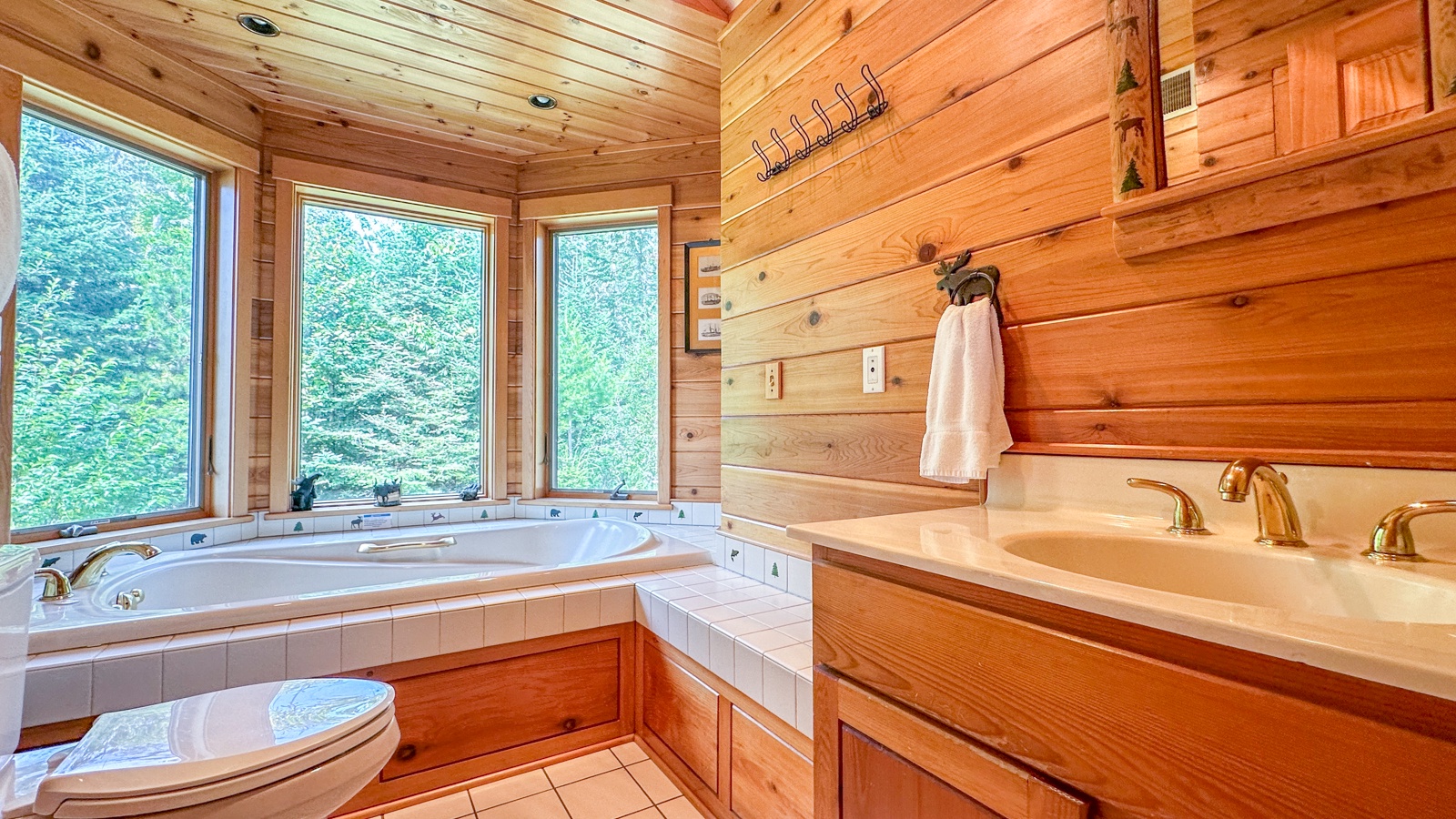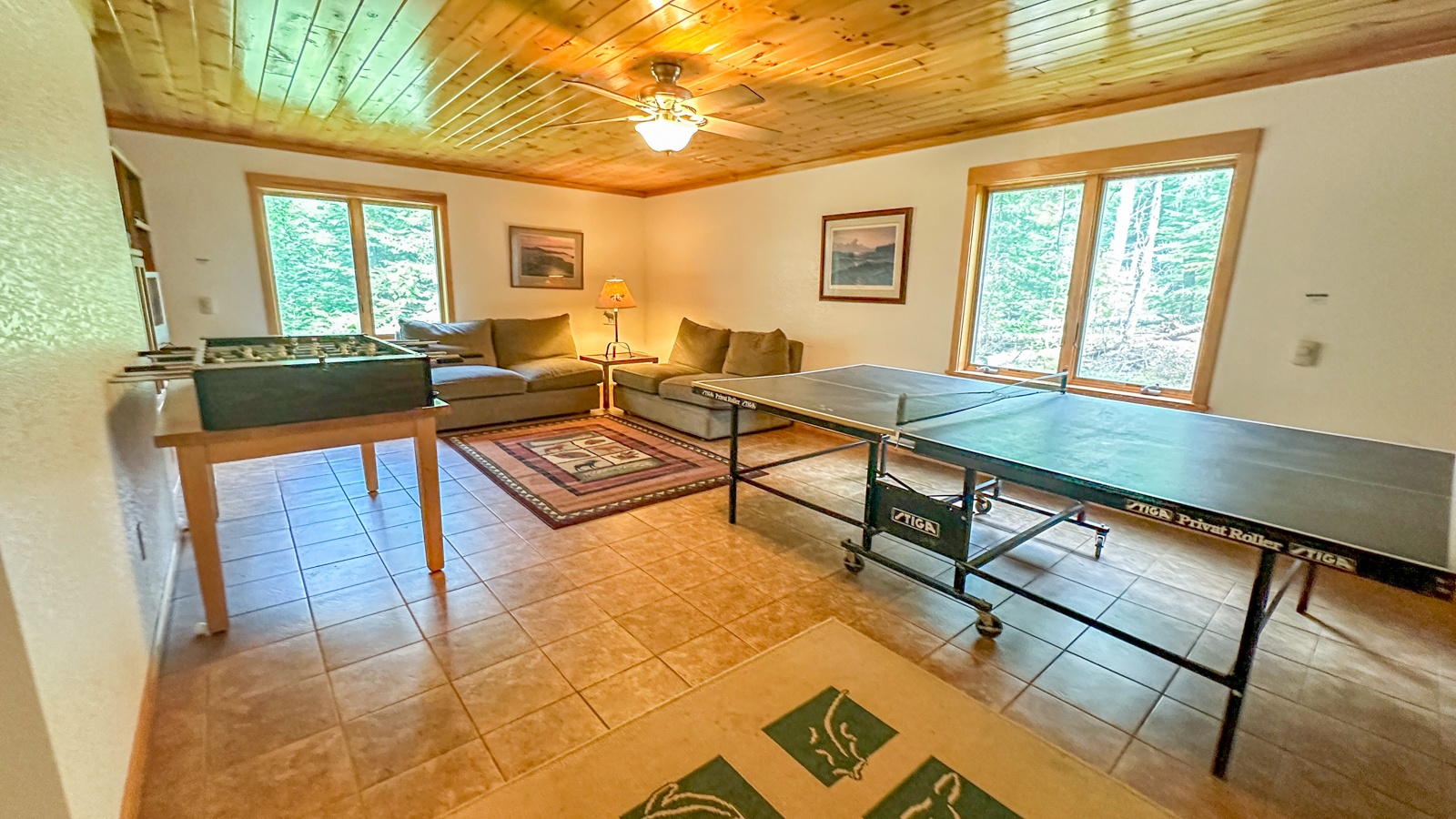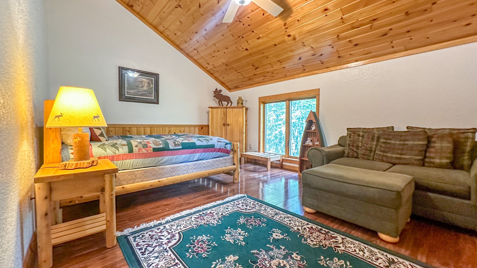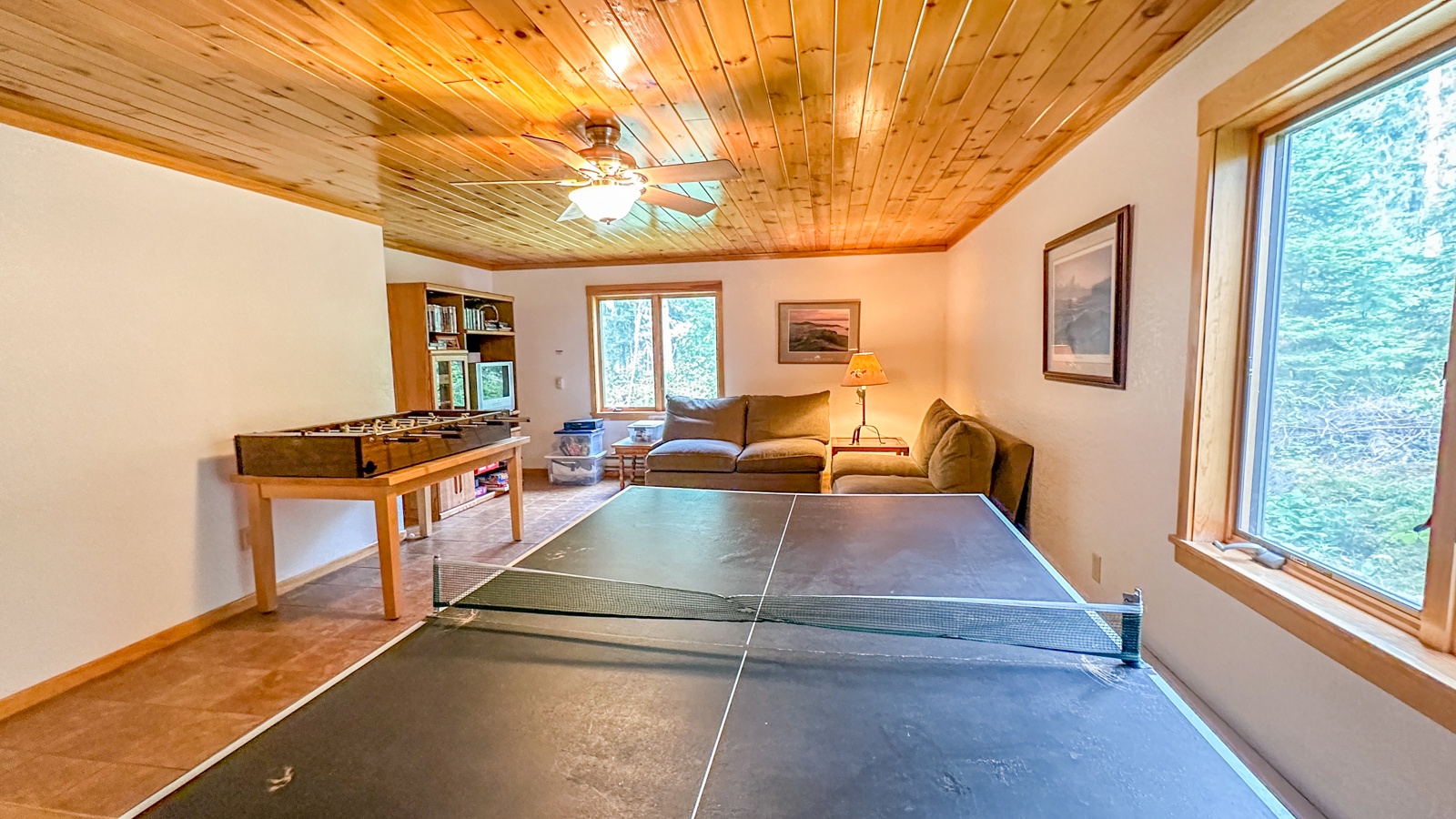 Melt the stress away in the cedar sauna and pamper yourself in the jetted tub complete with a towel warmer. Gather with family and friends for a game of darts or stroll out to the bunkhouse for a game of foosball or ping pong. The main home offers 2 bedrooms, a sleeping loft, and 2 full bathrooms. There is also a bunkhouse with two sleeping lofts and another bedroom that also features a large rec room - perfect for the kids! There is no bathroom in the bunkhouse, but there is a nearby outhouse and guests can always go to the main house just 75 feet away.