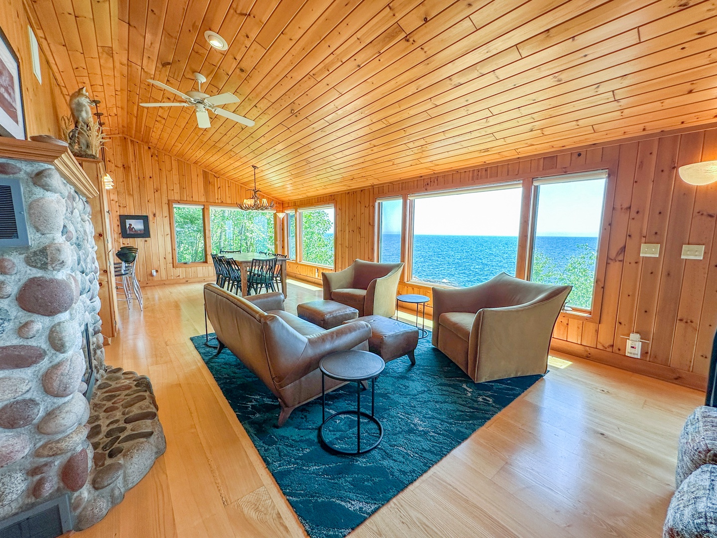 Enjoy everything that the Lake Superior shoreline has to offer at this spacious, luxury home and its cozy guest cabin. Wood steps lead to 300 feet of ledge rock shoreline for your enjoyment. Skip rocks or just sit on the shoreline with a good book and listen to the waves roll in during the summer months. During the November Gales, you will be amazed by the show the Lake puts on! Waves of 20-30 feet can be spotted regularly this time of the year.