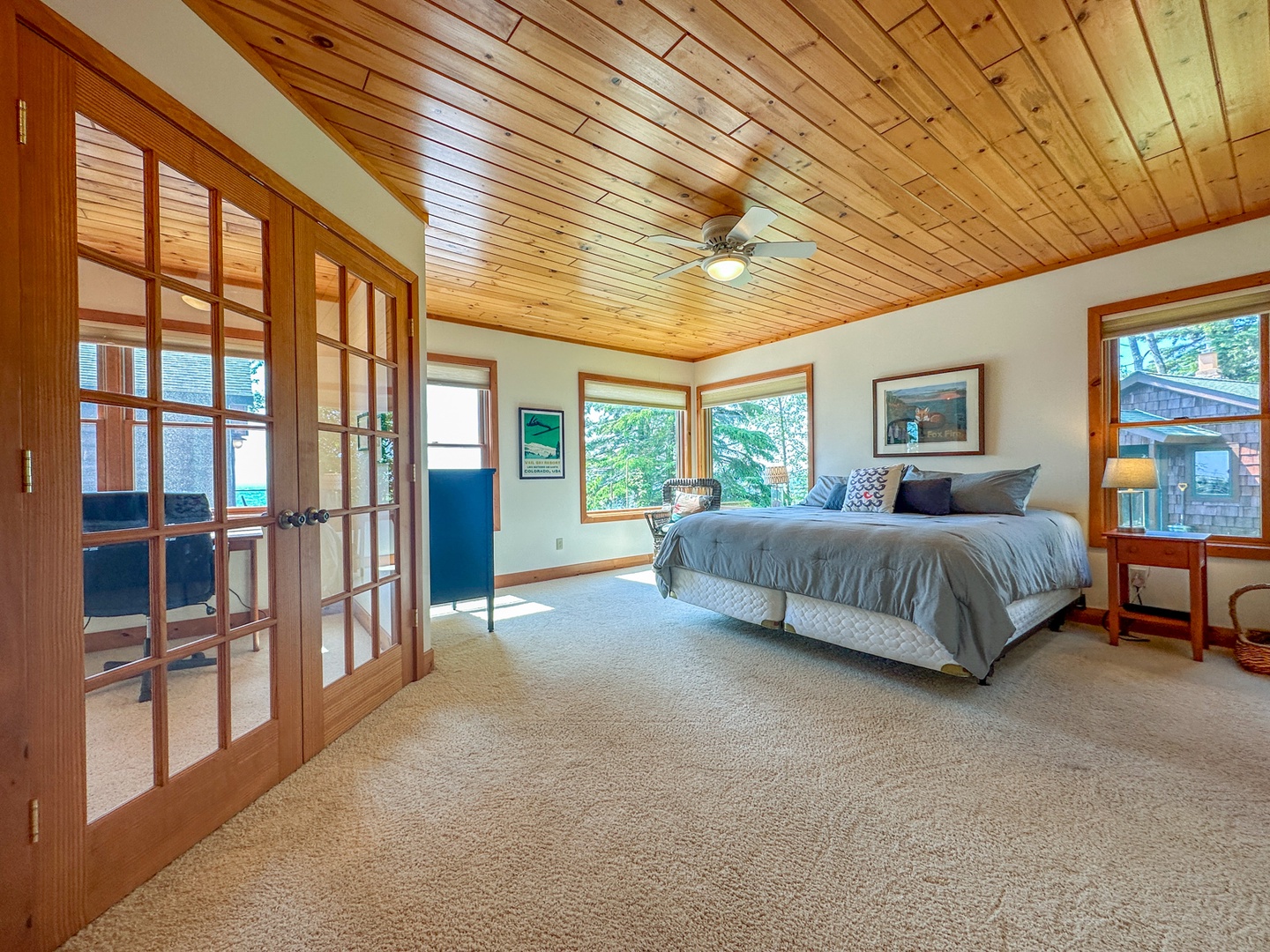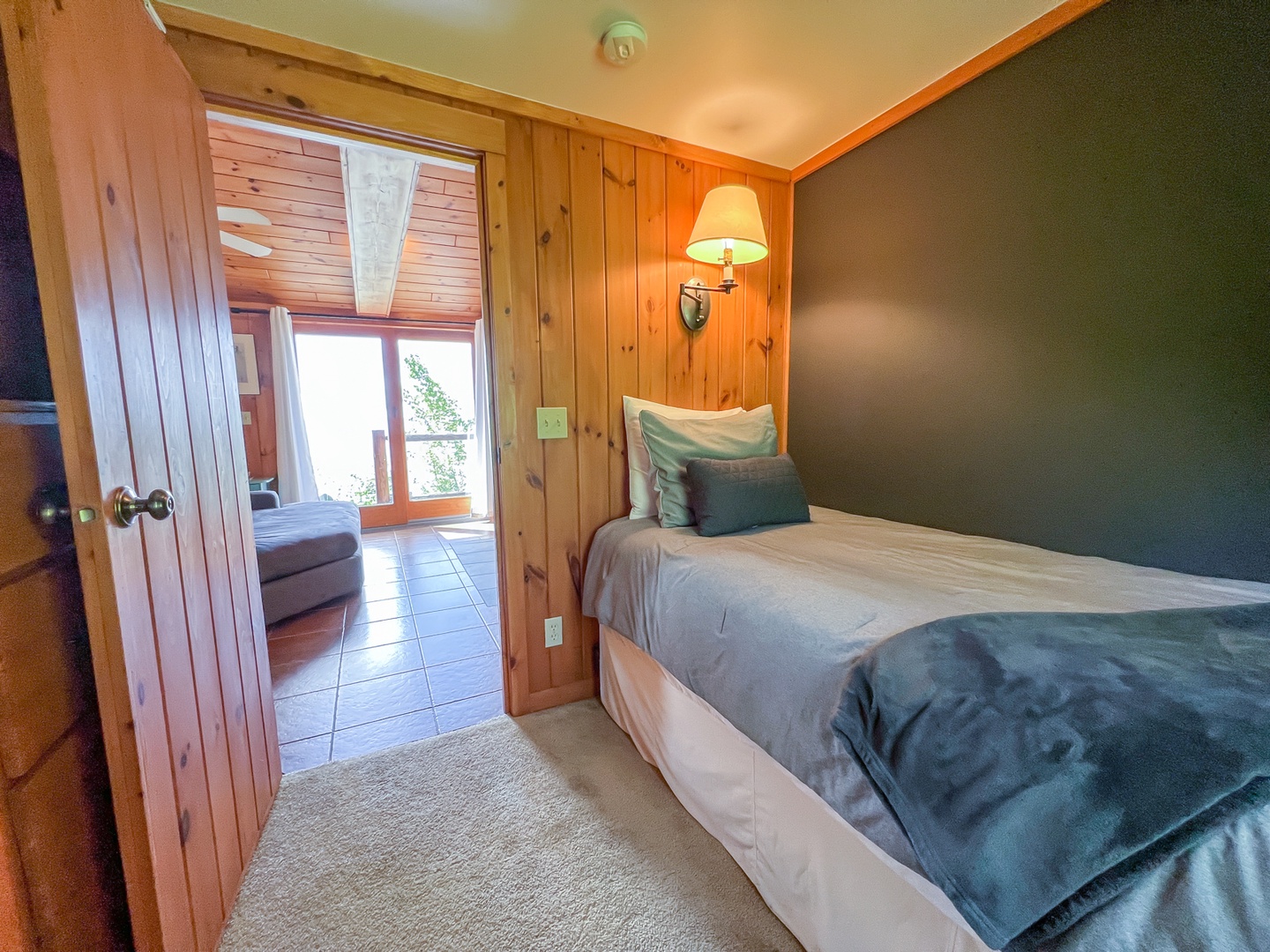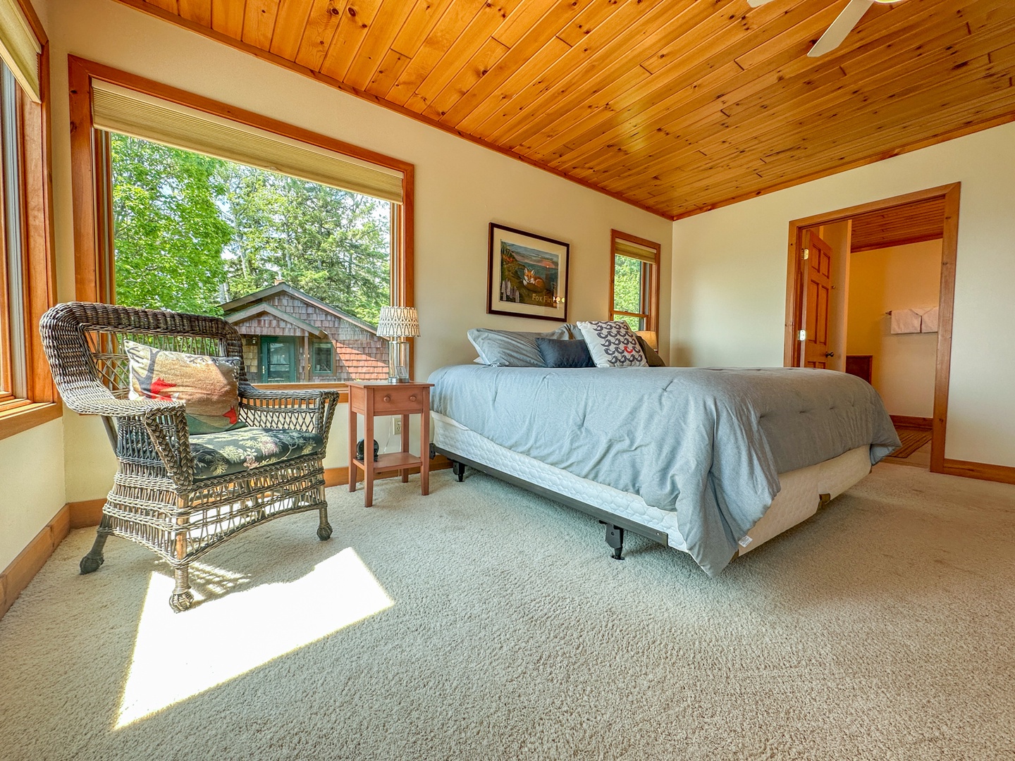 Foxfire is the luxury main home on this property. It boasts four spacious bedrooms and three full bathrooms spread out over two stories. Just a few of the amenities are a large common room with flat-screen TV and lake view, a large stone fireplace, well-equipped kitchen, a spacious lake-facing deck, tootsie-warming in-floor heat, and lots of windows for lake gazing.