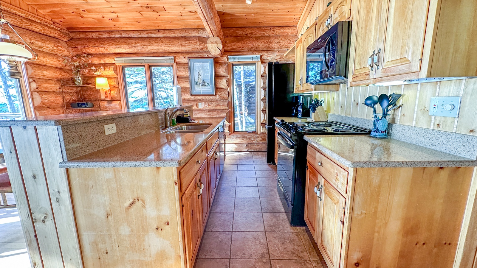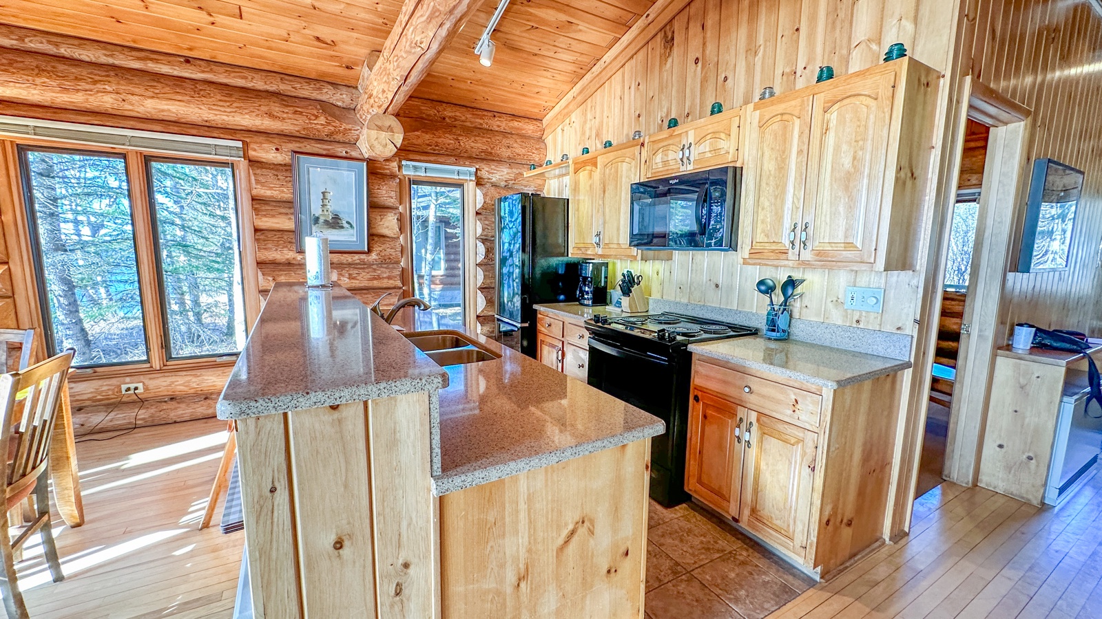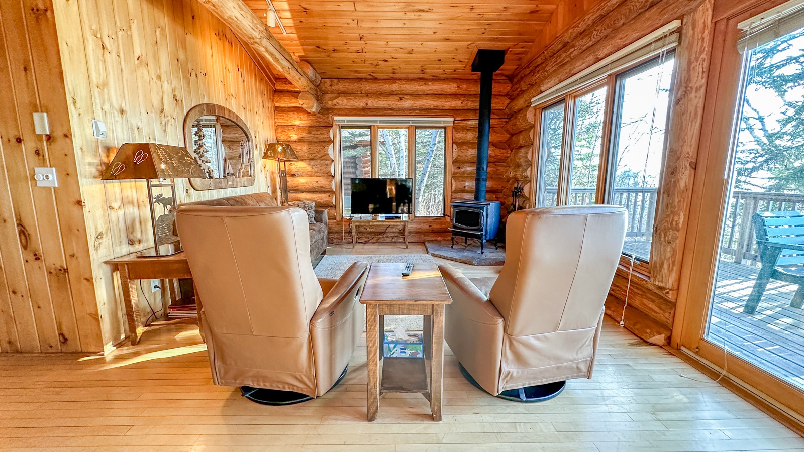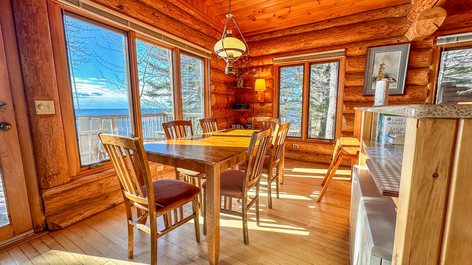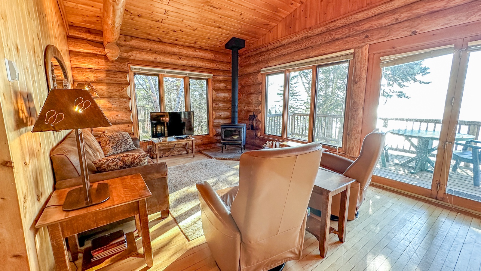Lutsen Log Cabin 406 is a true log cabin with vaulted ceilings providing a true Northwoods experience with wonderful views of Lake Superior from the picture windows. The cabin has a great room with a full galley kitchen, a dining area with room for the whole family, and a living room featuring a wood-burning fireplace. Enjoy Lake Superior views from the large windows or step out onto the lake-facing deck off the great room.