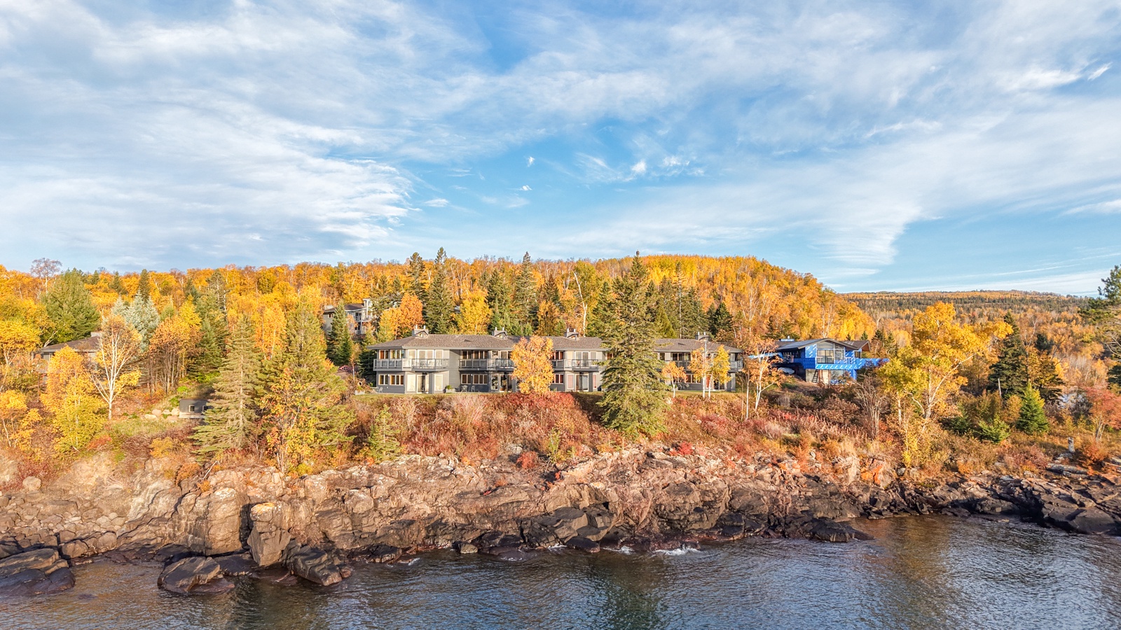 Enjoy a romantic getaway in terrace Point 13B, a unique condo inspired by the architectural style of Frank Lloyd Wright with sweeping lake superior views. Listen to the sound of the waves hitting the shoreline at Terrace Point 13B while the point of Grand Marais, Minnesota is visible in the distance just a short four-mile drive away.